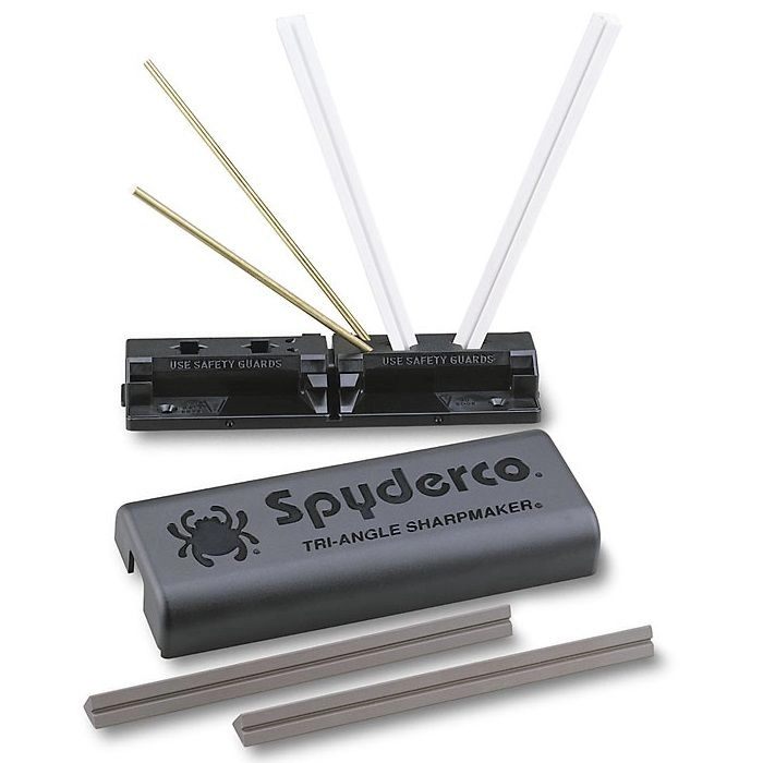 De uitmuntende Tri-Angle Sharpmaker is een messen messenslijpset uit het ruime assortiment van topmerk Spyderco. Deze set bestaat uit 4 hoogwaardige keramische slijpstaven. Hiervan zijn 2 staven voor het daadwerkelijke slijpen en 2 staven voor een vlijmscherpe afwerking. De staven zijn onder meerdere hoeken in het meegeleverde kunststof voetstuk te plaatsen. Dit zodat u ten alle tijden zeker bent van de juiste slijphoek. De slijpstaven dienen droog gebruikt te worden, maak deze dus voor het slijpen niet nat. Maak daarnaast bij het slijpen ook geen gebruik van olie. Dit slijpsysteem wordt geleverd inclusief een heldere handleiding en instructie DVD.